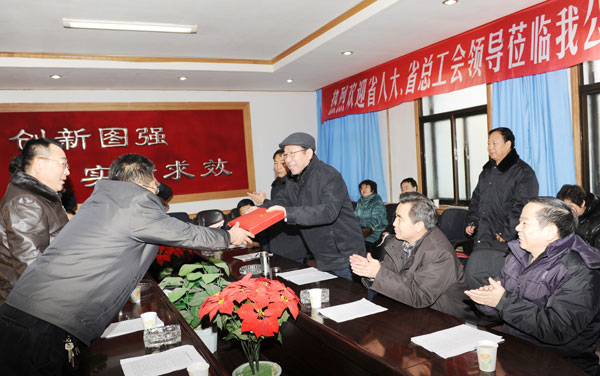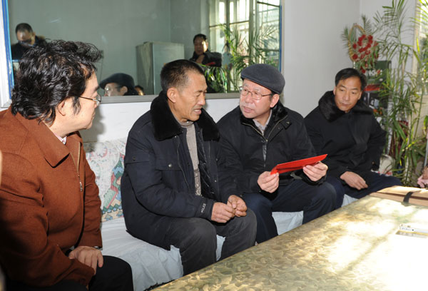 随后,穆东升副主任分别来到困难职工张成钧和省劳动模范、退休职工星占江家中,亲切看望和慰问他们,并送去慰问金和慰问品。在困难职工张成钧家中,穆东升副主任与张成钧的父亲促膝交谈,嘘寒问暖,在详细了解了他的家庭生活情况和对张成钧因摔伤导致长期昏迷的治疗情况后,穆东升副主任说,目前,你们的生活遇到了一些困难,但是党、政府和社会一直关心着大家,随着我省经济社会的发展,党和政府会逐步加大对困难群众的帮扶力度,希望你们树立起战胜困难的勇气和信心,让我们共同努力,渡过难关。随后,穆东升副主任在张成钧病床前叮嘱有关负责同志和家人一定要关心、照顾好张成钧的生活,积极治疗,使他早日康复。