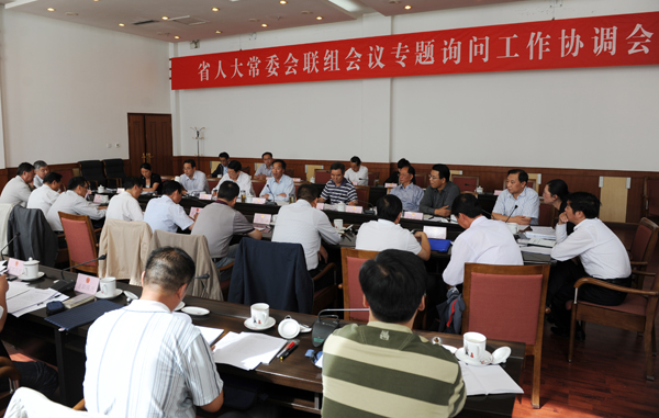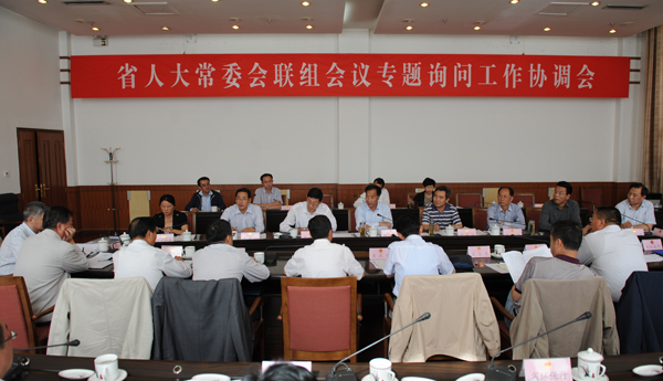 8月29日下午,省人大常委会秘书长蔡德贵主持召开省人大常委会专题询问工作协调会,省人民政府副秘书长晁海军,省环保厅、省经委、省财政厅、省国土厅、省住建厅、省水利厅、省农牧厅、省林业厅、省政府法制办、省安监局、省金融办等相关部门的负责同志,省人大环资委负责同志,省人大常委会副秘书长,各相关处室负责人参加了会议。