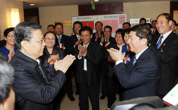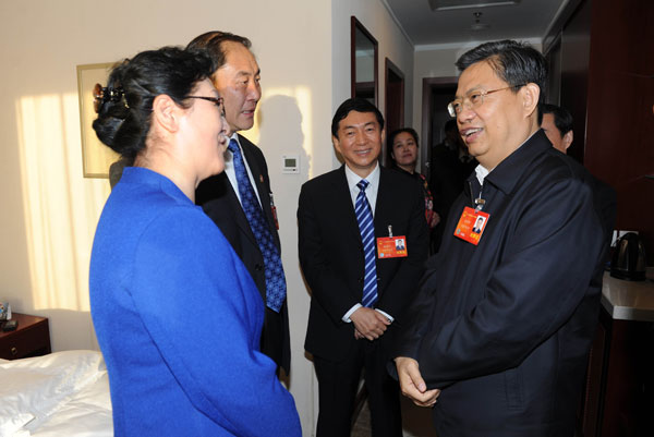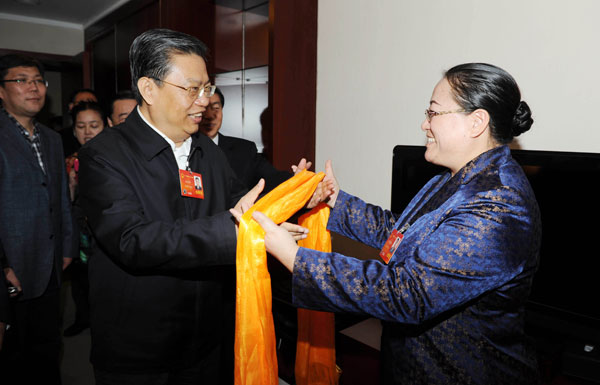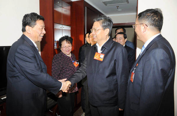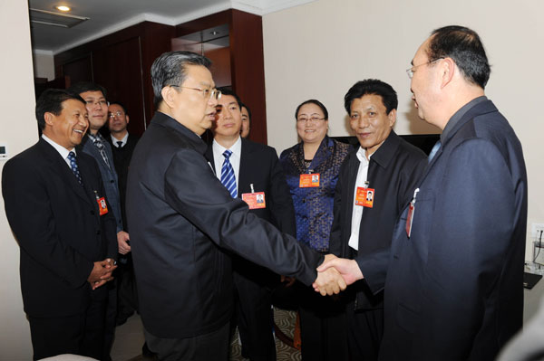 省委书记骆惠宁、省长郝鹏、省人大常委会副主任穆东升的陪同下,赵乐际走进代表房间,与代表们一一握手,亲切问候、交谈。娘毛先、尼玛卓玛、王玉虎代表给赵乐际同志敬献了哈达。宗贻平、李小松、毕生忠、王玉虎等代表就青海油田生产经营、农牧区变化、玉树重建等情况作了认真回答,赵乐际听后非常高兴,鼓励大家要再接再厉,努力创造幸福生活、建设美好家园。临别之际, 赵乐际同志与我省代表合影留念,并祝福大家工作顺利、身体健康,祝愿青海的明天更美好。
