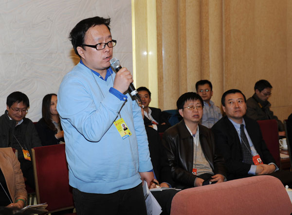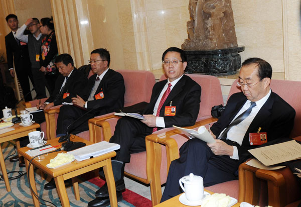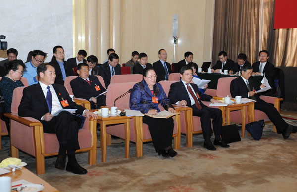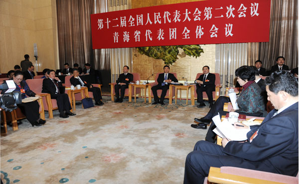 3月5日下午,参加十二届全国人大二次会议的我省代表团在人民大会堂青海厅举行全体会议,审议政府工作报告,并对中外媒体记者开放。青海代表团团长、省委书记、省人大常委会主任骆惠宁主持会议。 郝鹏、王晓、尼玛卓玛、李小松、王予波、王玉虎先后发言。