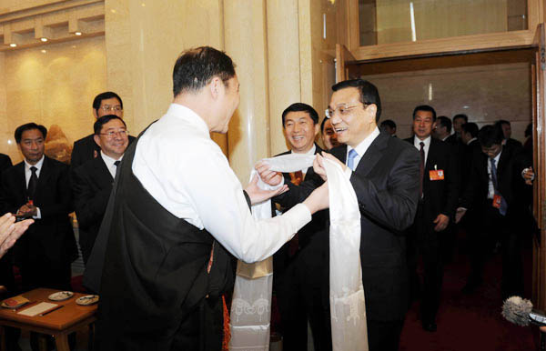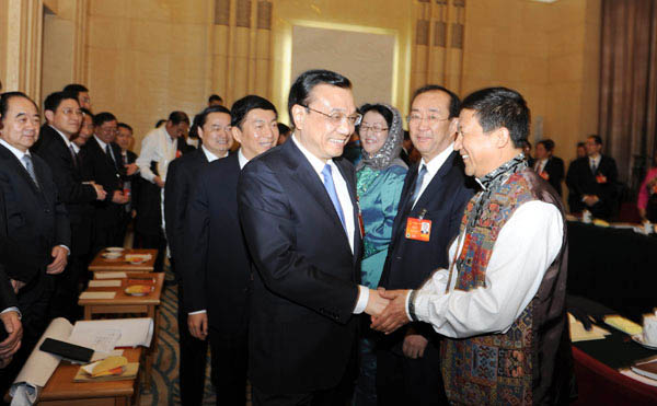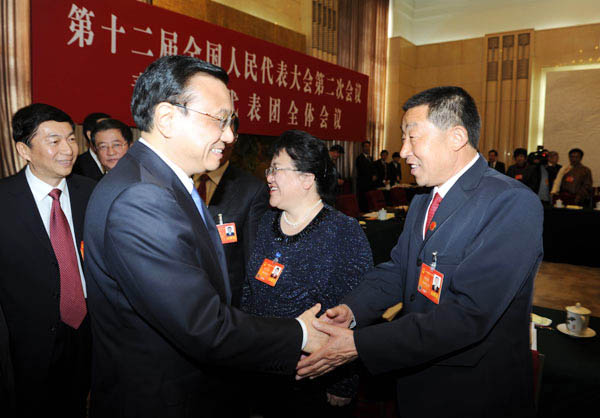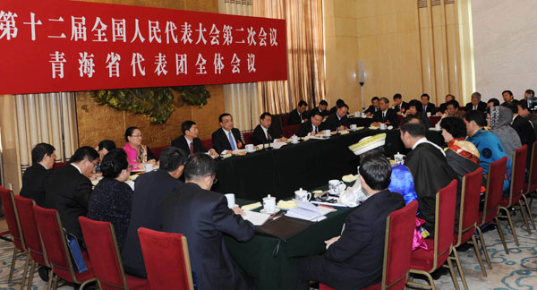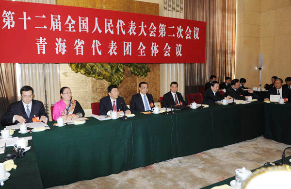 3月6日下午,我省代表团审议政府工作报告,中央政治局常委、国务院总理李克强参加青海代表团审议,同代表亲切握手,并作重要讲话。