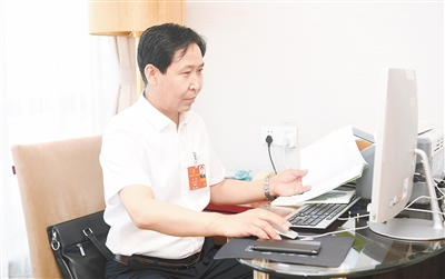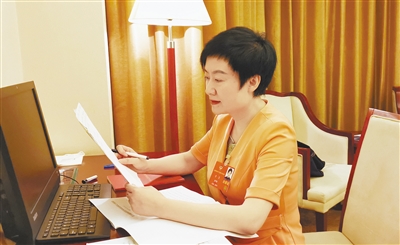 ←我省全国人大代表孟海通过视频完善发言材料。