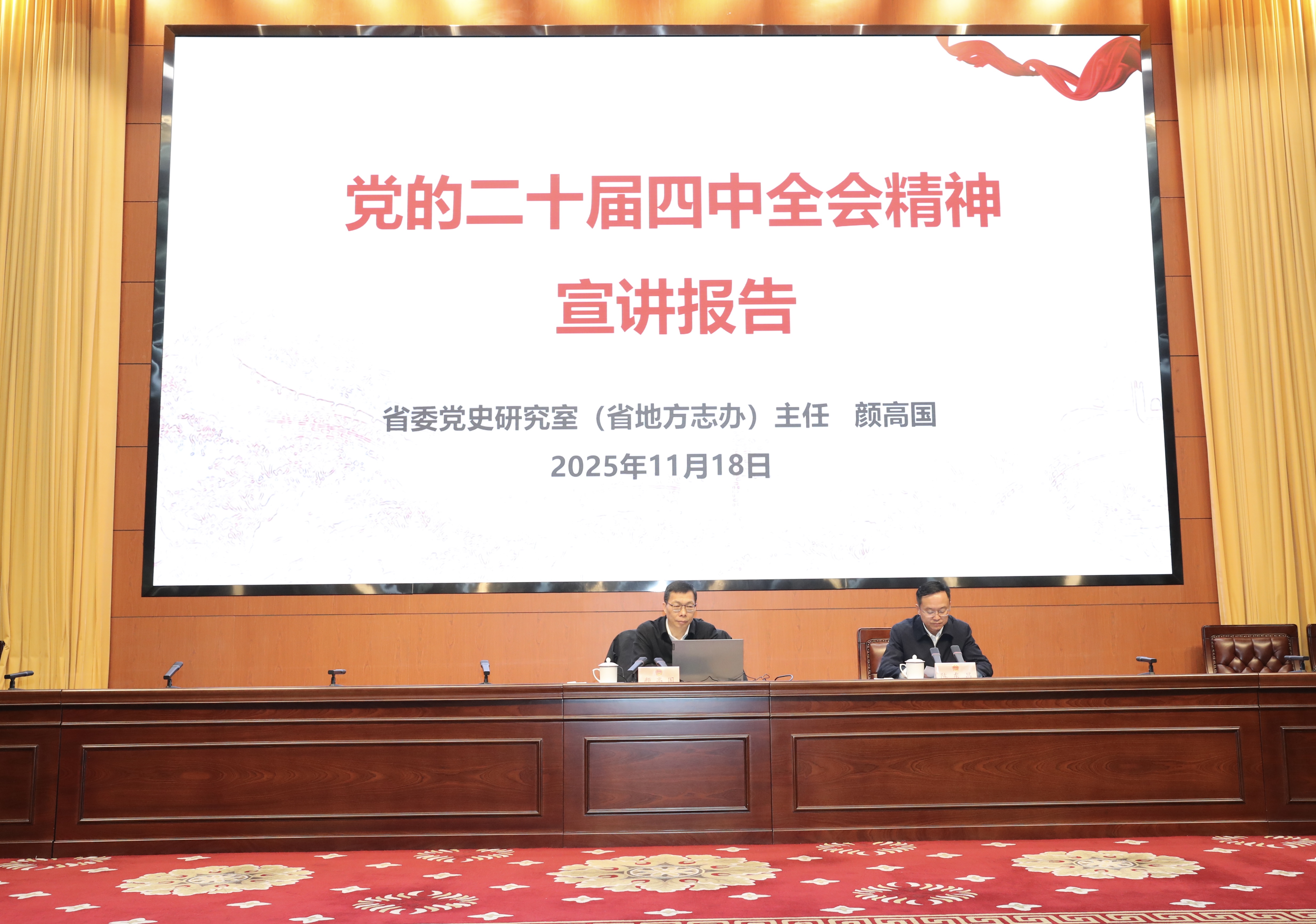 根据省委部署和省人大常委会党组安排,11月18日上午,省人大机关举办深入学习贯彻党的二十届四中全会精神宣讲报告会。省委宣讲团成员、省委党史研究(省地方志办)主任颜高国作宣讲报告。省人大常委会机关党组书记、秘书长陈东昌主持宣讲报告会。机关全体党员、干部参加。