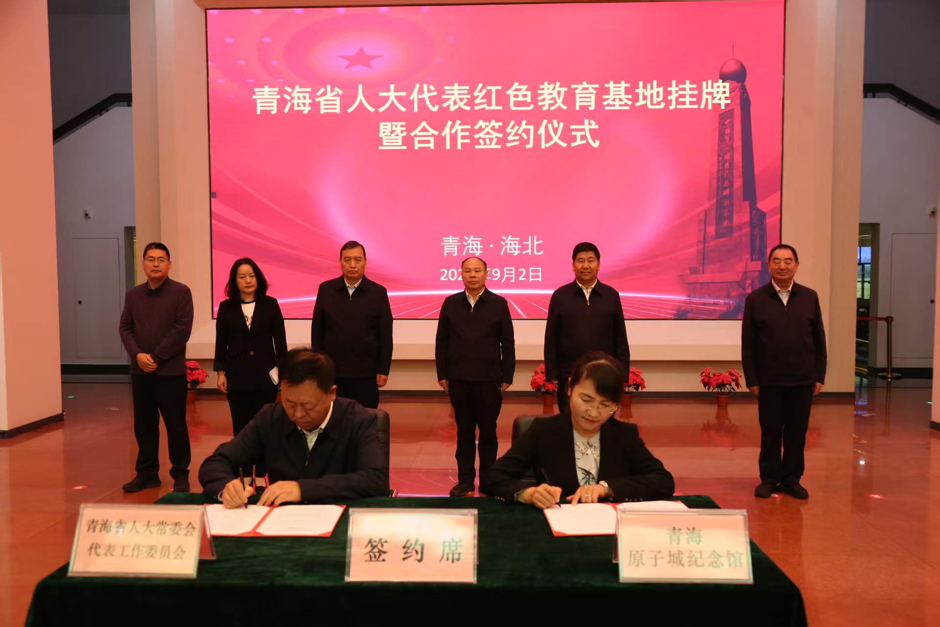 杨逢春和司吉昇共同为“青海省人大代表红色教育基地”揭牌。省人大常委会代表工委主任刘志德与青海原子城纪念馆馆长马清芳签订合作协议书。