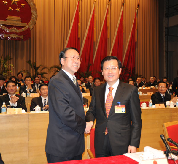 1月22日,在省十一届人大四次会议上,省委书记、省人大常委会主任强卫与新当选的省人大常委会副主任穆东升亲切握手。