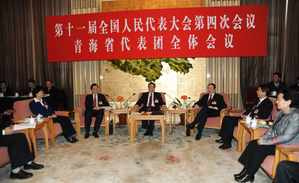 3月11日上午,中共中央政治局常委、国务院副总理李克强看望我省出席十一届全国人大四次会议的代表,和代表一起审议报告,并就青海经济社会发展作重要讲话。