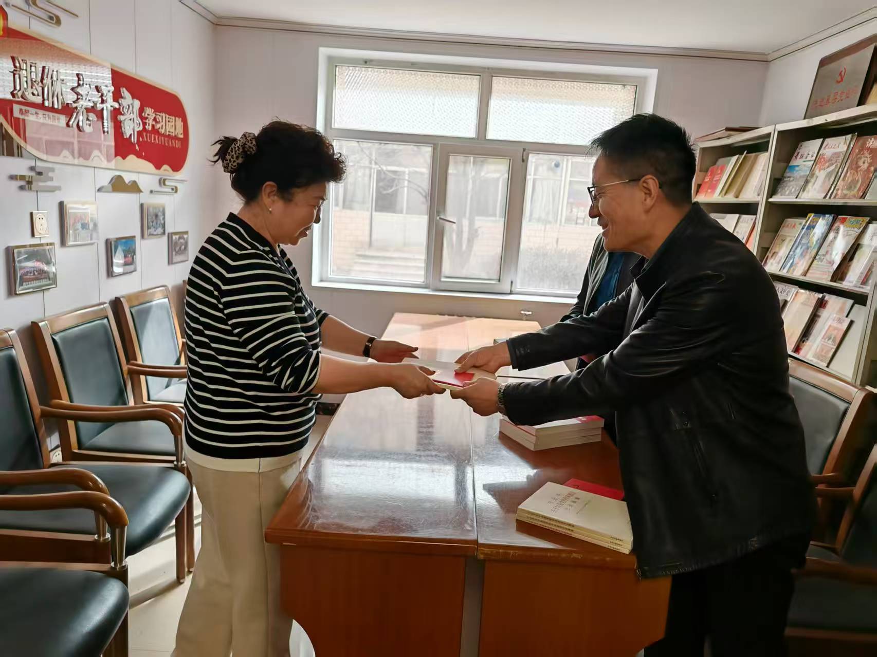 在机关老干部活动室,党员代表为老党员送去学习教育相关资料,传达最新文件精神,用通俗易懂的语言向老党员们领读《习近平关于加强党的作风建设论述摘编》和《习近平总书记关于党的建设的重要思想概论》重点内容,耐心地为他们解读党的最新理论。同时,仔细询问他们的身体状况、生活起居,倾听他们讲述过去在人大机关的奋斗故事和宝贵经验,用“面对面”的温情服务架起党组织与老党员的“连心桥”。