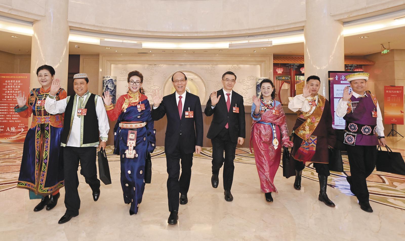 3月5日上午,出席十四届全国人大四次会议的青海代表团代表意气风发、信心满满前往人民大会堂。记者 张地委 摄