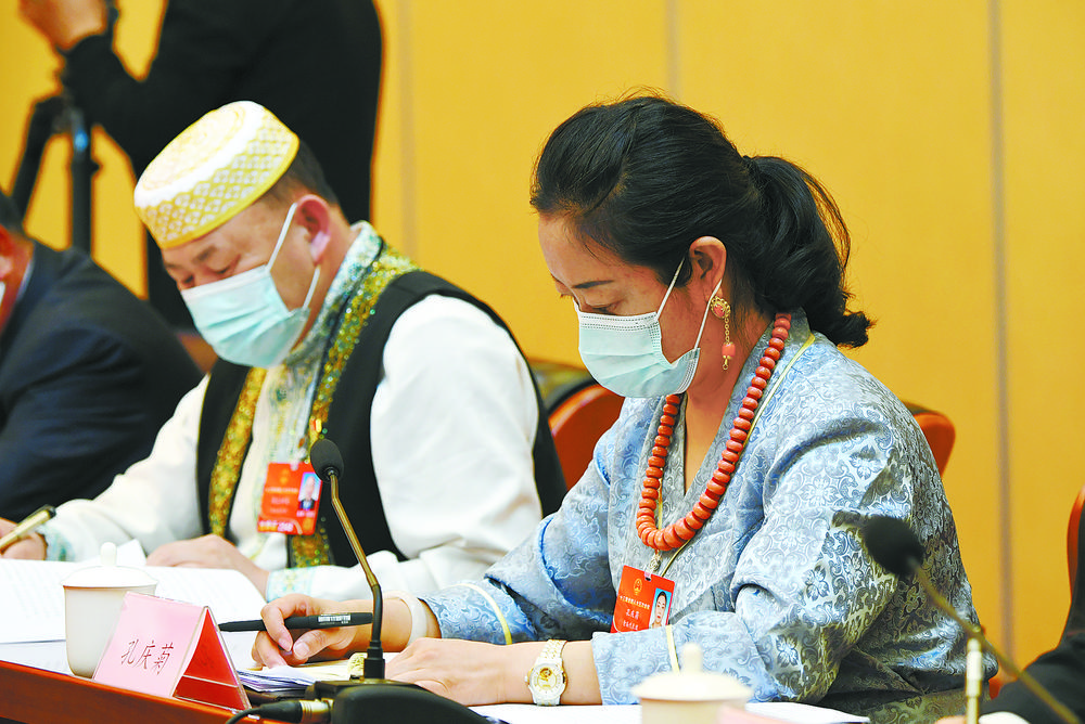 分组讨论间隙,金花委员(左)与其他委员一起学习政协常委会工作报告。记者张地委整理