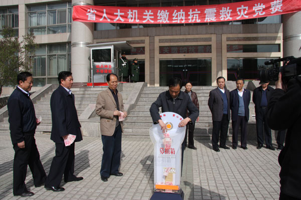 4月18日(星期日)上午,省人大机关院内人头攒动,机关办公楼大门中央的横幅上“省人大机关缴纳抗震救灾党费”格外醒目,由省人大常委会机关组织的缴纳抗震救灾党费活动正在这里举行。