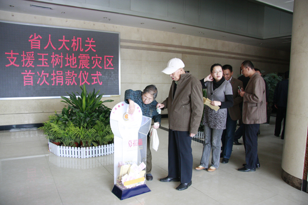 情系玉树,心向灾区。4月15日上午10时,省人大常委会机关200多名干部职工和离退休老同志积极响应省人大常委会党组号召,纷纷伸出援助之手,向玉树灾区积极捐款,一些在外出差的领导和同志们也纷纷委托在家的同志们代为捐款,短短两个小时共捐款116620元,以自己的实际行动,表达对灾区群众的爱心。下午3时,常委会办公厅又紧急购买了价值7万元的方便面、火腿肠、饮用水等物资,由常委会秘书长蔡德贵、副秘书长满晓鸿亲自送往玉树灾区。