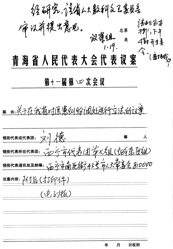 在本次会议规定的议案截止时间之内,大会秘书处议案审查组收到西宁市代表团刘德等15名代表提交的《关于我省对医患纠纷调处进行立法的议案》1件。