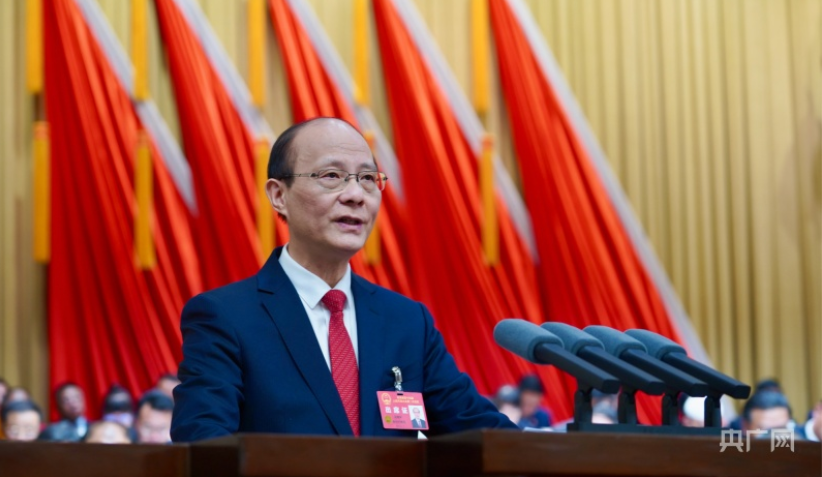 吴晓军代表青海省人民政府向大会作《政府工作报告》(央广网记者 张海东 摄)